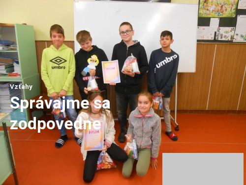 Dňa 22. 11. 2019 sa v priestoroch našej školy realizoval projekt Správajme sa zodpovedne, ktorý bol realizovaný za pomoci transferov z mesta. Cieľom projektu bolo prispieť k bezpečnému správaniu detí na cestách poznaním základných pravidiel cestnej premávky; vedieť poskytnúť prvú pomoc pri poranení a úrazoch; poznať tiesňové volania záchranných zložiek; priviesť deti k tomu, aby si uvedomili, že za svoje zdravie sú zodpovedné aj ony samy. Pri týchto aktivitách sme v žiakoch podporovali vytrvalosť, trpezlivosť a odhodlanie popasovať sa s prekonávaním prekážok. Tento projekt bol určený pre žiakov 3. – 8. ročníka. Žiaci boli rozdelení do troch kategórií: I. kat. – žiaci 3. a 4. ročníka; II. kat.- žiaci 5. a 6. ročníka a III. kat. – žiaci 7. a 8. ročníka. Spolu súťažilo 11 družstiev v troch disciplínach: prekážková dráha (prekonávať prekážky so zaviazanými očami za pomoci „navigátora“), dopravný test a prvá pomoc. Cieľom bolo tiež prispieť k tomu, aby sa žiaci cítili dobre, zabavili sa a zároveň si upevnili kamarátske vzťahy s rovesníkmi. K realizácii projektu prispeli svojou pomocou Mgr. M. Poliačiková, Mgr. R. Magdolenová, PaedDr. J. Kolníková a Mgr. D. Čačková.