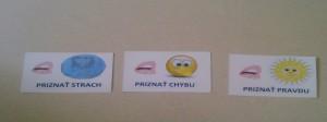 Deti si počas aktivít vždy posadajú do kruhu. Vyvolala som dve deti, jedno sa postavilo za druhé a opýtala som sa ostatných detí: „Je odvážny ten, kto je v úkryte?“ "Ak vyjde z úkrytu, je odvážny a prečo? Deti odpovedali na prvú otázku "Nie" a na druhú otázku odpovedali, že vystúpením z úkrytu prekonáva strach a rozvíja odvahu. Potom som deťom povedala, že aj my máme úkryt, ktorými sú naše ústa: Vyvolala som dve deti, jedno predstavovalo ústa. Rozpažilo si pred seba ruky a spojilo. Druhé bolo ukryté za prvým a podala som mu papierové karty s názvami a obrázkami: PRIZNAŤ STRACH, PRIZNAŤ CHYBU, PRIZNAŤ PRAVDU. Ostatné deti som upozornila na to, že tieto postoje sú veľmi dôležité, keď riešime nedorozumenia