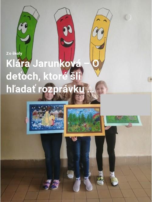 Mestská knižnica mesta Piešťany organizovali výtvarnú súťaž pri príležitosti 100. výročia narodenia skvelej slovenskej spisovateľky, prekladateľky, redaktorky Kláry Jarunkovej s názvom ,,O deťoch, ktoré šli hľadať rozprávku … “ Deti zo IV. oddelenia ŠKD sa zapojili do tejto súťaže a menovite Teodora Csépe, Laura Gilianová a Stela Mitterová a po prečítaní namaľovali rozprávky : O dievčatku, ktoré šlo hľadať rozprávku, Dedko a vlk, O psovi, ktorý mal chlapca. Práce sa vydarili, mali sme z nich veľkú radosť a teraz netrpezlivo čakáme na vyhodnotenie.