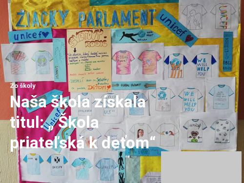 Školský žiacky parlament na našej škole nezaháľal ani v tomto školskom roku. Absolvovali sme vzdelávacie aktivity na tému: Chcem pomáhať a šport v pomoci. Svetový rodič. Po vyplnení Potvrdenia o absolvovaní vzdelávacej aktivity nasledoval ďalší krok: Fundraisingová aktivita, my sme sa zapojili do tvorby dizajnov tričiek na propagáciu Svetového rodiča – urobili sme vyše stovky návrhov a všetky sú veľmi pekné. Do návrhov sme zakomponovali názov Svetový rodič, alebo Staň sa Svetovým rodičom, vyrobili sme množstvo záložiek s touto tematikou. Záverečným krokom bolo vyplnenie evaluačného dotazníka a po jeho úspešnom absolvovaní sa môžeme hrdo pochváliť, že sa nám titul podarilo získať. Svedčia o tom aj slová, ktoré nám priamo z Unicefu napísal koordinátor pre školy: „Na našej spoločnej ceste sme sa tento školský rok dostali až k jej samotnému koncu. Bol to rok strastiplný, avšak spoločnými silami sme sa dokázali súčasnej dobe prispôsobiť a preto nás veľmi teší, že aj napriek všetkým prekážkam, ktoré nám pandemická situácia do našich životov priniesla, Ste na program Škola priateľská k deťom nezanevreli, ba naopak, splnili ste si všetky podmienky a tým Ste získali titul Škola priateľská k deťom 2020/2021. Dovoľte mi Vám teda v mene celého tímu Slovenskej nadácie pre UNICEF srdečne zablahoželať k získaniu titulu a zároveň sa Vám poďakovať za úžasnú spoluprácu a za to, že robíte náš spoločný svet krajším a hodnotnejším. Pevne veríme, že týmto školským rokom sa naša spolupráca nekončí a že v nej v rámci programu Škola priateľská k deťom budeme aj v nasledujúcom školskom roku pokračovať. „ BLAHOŽELÁME A ĎAKUJEME! Samozrejme v našej spolupráci s UNICEFOM budeme pokračovať aj v nasledujúcom školskom roku a budeme sa snažiť prispieť k tomu, aby bol náš svet krajší.