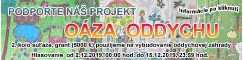 Ako máte hlasovať? Hlasovať môžete prostredníctvom webovej stránky https://www.nadaciavub.sk/komunitne-granty/. Kde na spodnej časti strany kliknete chcem hlasovať. Zvolíte Banskobystrický kraj a kliknete na náš projekt OÁZA ODDYCHU. Zadáte mobilné telefóne číslo, na ktoré Vám príde verifikačný kód, ktorým následne overíte svoj hlas. Verifikačný kód je zaslaný na mobilné telefónne číslo práve raz a má obmedzenú platnosť. Hlasovanie je bezplatné! Hlasovanie sa uskutoční v období od 2.12.2019, 00:00 hod. do 15.12.2019, 23:59 hod.