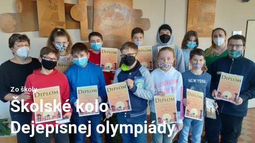 10.12.2021 sa uskutočnilo školského kolo Dejepisnej olympiády, ktoré sa uskutočnilo online formou, prostredníctvom EduPage. Olympiády sa zúčastnili žiaci 6. – 9. ročníka, spolu 20 žiakov. Všetci žiaci boli veľmi dobre pripravení, za čo im patrí veľká pochvala.