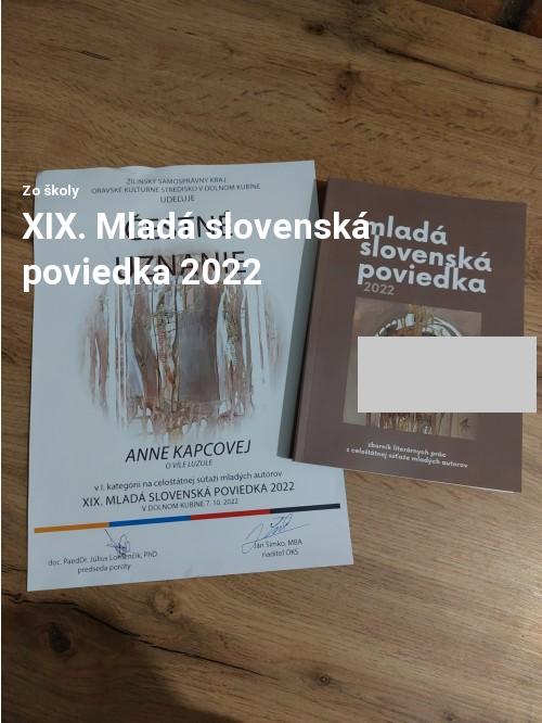 Celoštátna literárna súťaž Mladá slovenská poviedka je jednou z vrcholných súťaží v oblasti literárnej tvorby na Slovensku. Súťaže sa každoročne zúčastní priemerne sto autorov zo Slovenska i zo zahraničia (zahraniční Slováci). Literárne texty hodnotí porota zložená s významných slovenských literátov a vysokoškolských pedagógov. Vyhlasovateľ a organizátor súťaže je Oravské kultúrne stredisko v Dolnom Kubíne Spoluorganizátorom súťaže je Spolok slovenských spisovateľov a Oravská knižnica Antona Habovštiaka v Dolnom Kubíne. Poslaním súťaže je umožniť sebarealizáciu detí a mládeže so vzťahom k literatúre, aktivizovať tvorivý rast mladých talentov, dať možnosť verejnej prezentácii a tvorivej konfrontácii ich tvorby a zvýšiť záujem u mladej generácie o pôvodnú slovenskú literárnu tvorbu. Do tejto literárnej súťaže sa zapojila aj naša žiačka Anna Kapcová /VII.A/, ktorá získala čestné uznanie za poviedku O víle Luzule. Aničke srdečne blahoželáme a prajeme veľa úspechov v ďalšej literárnej tvorbe!
