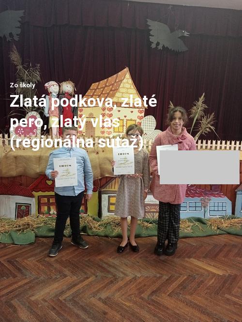 Dňa 26.10.2023 sa v Drienčanoch konal XVIII. ročník regionálnej súťaže v prednese slovenskej rozprávky „Zlatá podkova, zlaté pero, zlatý vlas“. Toto podujatie je venované významnému slovenskému rozprávkarovi Pavlovi Emanuelovi Dobšinskému (16.3.1828 –22.10.1885). Okrem súťažnej časti podujatia mohli recitátori navštíviť aj Pamätnú faru P. E. Dobšinského – Múzeum rozprávky. Našu školu v tejto súťaži reprezentovali traja žiaci: Ivan Gecko (IV.A), Dominika Kántorová (V.B) a Viktória Ires Laet Slovák (V.B). Všetci žiaci získali diplomy za účasť. Želáme im veľa šťastia v ďalších súťažiach.