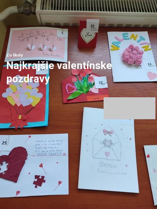 Február, mesiac lásky. Jedným zo spôsobov, ktorým ju môžeme dať najavo, je valentínsky pozdrav. Do súťaže o „Najkrajší valentínsky pozdrav“ sa zapojili žiaci celej školy. Vytvárali ich na hodinách výtvarnej výchovy, v školskom klube, ale i doma, počas chrípkových prázdnin. Najlepšie práce boli vystavené na hlavnej chodbe, kde si ich všetci mohli pozrieť. O víťazoch hlasovali pedagogickí i nepedagogickí zamestnanci a členovia Školského parlamentu. Celkovo bolo 53 súťažných pozdravov (36 z prvého a 17 z druhého stupňa). Ocenili sme 10 prác: Filip Melich (4.), Tomáš Krajč (4.), Lívia Krajčová (2.), Natália Mlynáriková (4.), Martina Krajčová (5.), Alexandra Šimková (5.), Eva Slugeňová (6.), Jasmin Čitáriová (5.), Mia Mária Mikulášová (7.), Lukáš Troiak (4.). Víťazi si prevzali ceny počas karnevalu.