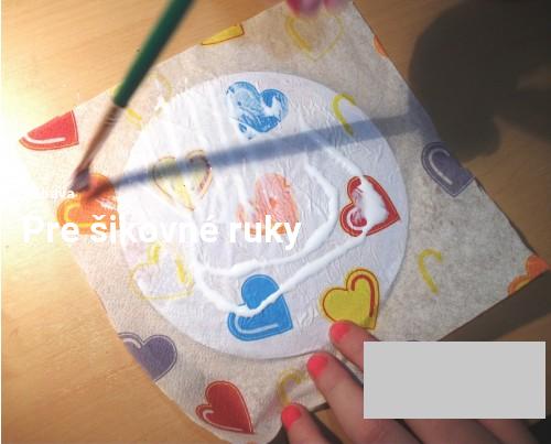 Postup: 1. Pripravíme si všetky pomôcky. 2. Pripravíme si farebné obrúsky podľa fantázie. 3. Pomocou CD-čka si obkreslíme kruh z bieleho napr. kancelárskeho papiera. 4. Obkreslený a vystrihnutý kruh prilepíme na CD lepidlom a necháme chvíľu zaschnúť. 5. Vrchnú stranu bieleho prilepeného papiera rozotrieme lepidlom za pomoci štetca. 6. Na stranu potretú lepidlom položíme vystrihnutý obrúsok a jemne s druhým štetcom vyhľadíme nerovnosti. 7. Z rozvrstvenej časti použijeme iba farebnú časť obrúska. 8. Vrch obrúska znova potrieme lepidlom pomocou štetca (jemne, aby sme nepretrhli obrúsok). Na ešte mokré lepidlo nanesieme ozdôbky podľa vlastnej fantázie. Lepidlo necháme úplne zaschnúť. 9. Na záver obstriháme zbytočnú časť obrúska. 10. A na záver ukážka aj iných vyrobených podložiek pod hrnček.