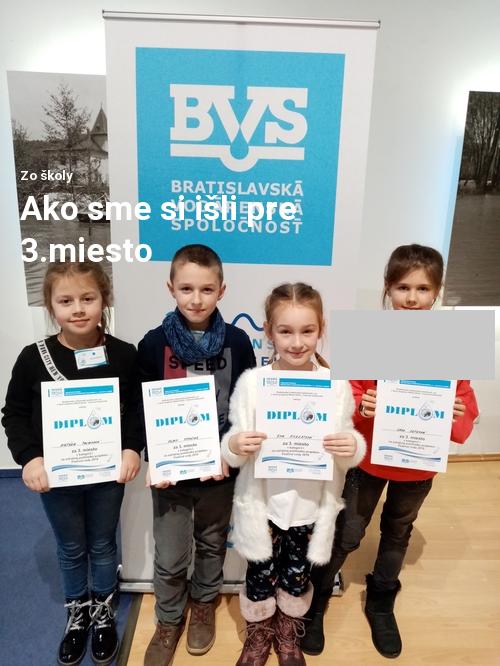 Vodárenské múzeum v Bratislave už tradične organizuje súťaž Festival vody. Súťaž je zameraná na tvorbu a prezentáciu projektov s problematikou vody. Taktiež vedie deti k spolupráci, keďže sa pracuje v 2-5 členných skupinách. Z prvého stupňa sa do projektu zapojili žiaci 3.B – Emka, Vilko, Larka a Viki. Vyberali sme si jednu zo štyroch tém. Oslovila nás téma „Voda vo vzdelávacom procese“. Našou úlohou bolo vytvoriť hru, prostredníctvom ktorej sa učíme o vode. Výsledkom našej práce je spoločenská hra: SKOČ SI S KVAPKOU. Hra je určená pre 2-4 hráčov, ktorí sa pohybujú po hracej ploche, dostávajú otázky, čítajú zaujímavosti, ale aj dodržiavajú pitný režim. Na hracej kocke je namiesto čísla šesť kvapka vody. Vždy, keď padne, je potrebné napiť sa vody. Počas hry si opakujeme vedomosti o vode, naučíme sa o nej niečo nové, ale sa aj zabavíme. V novembri sme sa dozvedeli, že postupujeme na finále súťaže do Bratislavy. Finále sa konalo 10.12.2019 vo Vodárenskom múzeu. Po príchode sme si pripravili naše projekty a jednoduchý plagát. Čakala nás prezentácia našej práce pred komisiou. Bol to náročný deň, plný nových zážitkov aj skúseností. V poobedných hodinách prišlo na rad záverečné zhrnutie a oceňovanie najlepších prác. Podarilo sa nám získať 3.miesto. Toto ocenenie nás veľmi prekvapilo a zároveň potešilo. Tímu 3.B gratulujeme!