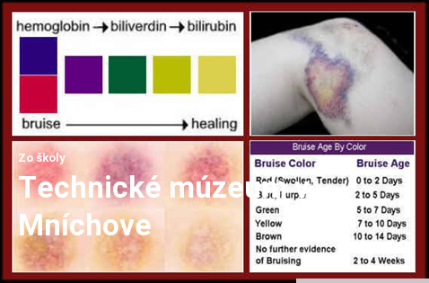 Počas našej návštevy Mníchovského technického múzea sme na 3 poschodiach mohli nahliadnuť do tajov fyziky, optiky, matematiky či chémie. V krásnych priestoroch mi však najviac bola srdcu blízka časť venovaná biológii a chémii. Veľká periodická tabuľka s príkladmi všetkých prvkov, termokamera či graf zloženia našej krvi boli veľmi zaujímavé, ale moju pozornosť nakoniec najviac upútal článok o téme, o ktorej som už predtým často uvažovala. Prečo modriny postupom času hrajú všetkými farbami než konečne zblednú?
