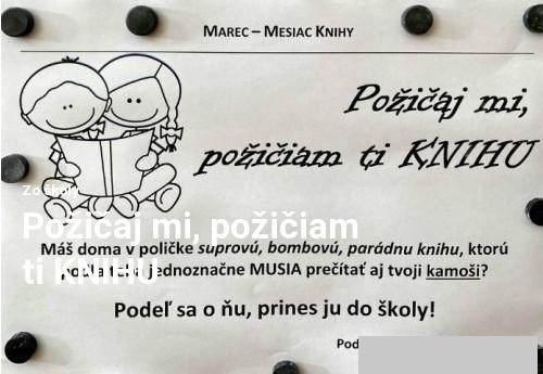 Požičaj mi, požičiam ti KNIHU Máš doma v poličke suprovú, bombovú, nezvyčajnú knihu, ktorú podľa teba jednoznačne musia prečítať aj tvoji kamoši? Podeľ sa o ňu, prines ju do školy! Takto znela výzva na marec. Začali sme v školskej knižnici zhromažďovať knihy z domácich políc, aby sme si ich v rámci školy mohli povymieňať a prečítať. No zastihla nás „kovidsituácia“, preto sa celoškolská výmena nestihla uskutočniť. Posledný deň pred prerušením vyučovania si však aspoň prváci vymenili svoje knihy medzi sebou navzájom a dali si za úlohu knihu prečítať, napísať o nej pár riadkov a nakresliť obrázok. Kamošom sa knihy vrátia, keď sa konečne vrátime do školy. V galérii sa pozrite na vydarené práce našich prvákov.