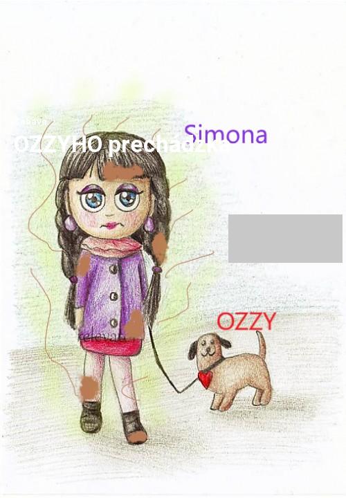 Volám sa Simona (skrátene Simi) a môj pes je OZZY. Hovorím z vlastnej skúsenosti. Aby ste mi verili, jednu prechádzku vám ukážem. Najskôr je postroj. Sú rôzne typy psov, čo sa týka postroja. Jedni sa klepú, druhí sa doň tešia. Ale OZZY taký nie je. Naháňam ho po celom dome. Zrazu padnem do žltej mláčky plnej šťastia. Neboj sa! Nepadla som tvárou, ale tričkom. Čiže, keď som mláčku utrela, umyla a prezliekla sa, OZZY si nechal nasadiť postroj. Neviem, asi z ľútosti.