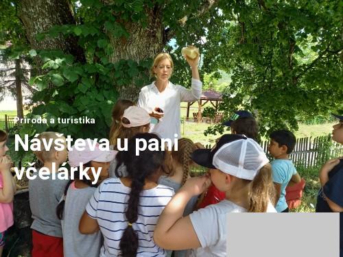 Sedeli sme pod obrovskou zakvitnutou lipou, z ktorej sa šírila sladká vôňa nektáru. Konáre boli obťažkané bzučiacimi včelami a čmeliakmi. My sme si posadali a započúvali sa do zaujímavého rozprávania o živote včiel. Pani včelárka mala pre nás pripravené rôzne obrázky a názorné pomôcky, ktoré sme si mohli ohmatať a zblízka pozrieť. Deti si mohli obzrieť plásty, vyskúšať si ochranný oblek včelára, rôzne nástroje, ktoré sa pri tom používajú. Videli sme úle a v nich včielky "modelky", ktoré boli pokojné a dovolili nám sa na nich pozerať. Na záver nám pani včelárka dala ochutnať rôzne druhy medu z rôznych oblastí Slovenska.