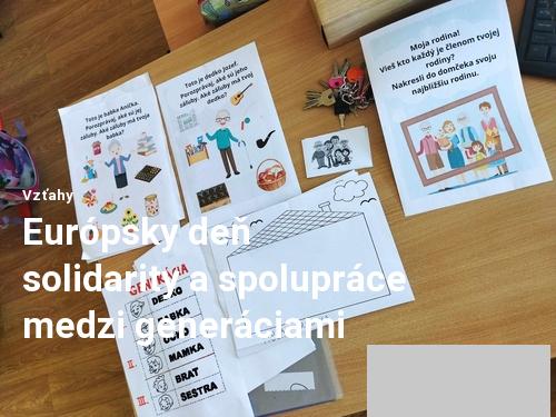 Dňa 29.04.2024 sa uskutočnila aktivita „Európsky deň solidarity a spolupráce medzi generáciami“ v ŠKD 3. B triedy. Túto aktivitu si pripravila pedagogická asistentka Mgr. Lucia Kušniráková v spolupráci s pedagogickou asistentkou Kristínou Haľkovou. Na úvod sa žiakom vysvetlilo, že tento deň sa oslavuje od roku 2009 za účelom podpory vzájomnej solidarity, rešpektu a záujmu o život jednotlivých generácií v členských štátoch EÚ. Vysvetlili sme si pojem generácia a aj to, že každá veková kategória má typické znaky, ktoré k nej patria. Charakterizovali sme si starších ľudí, ako sa môžu títo ľudia vyrovnávať s negatívnymi stránkami starnutia a čo môžeme urobiť pre našich starých rodičov, aby sme im uľahčili ich starnutie. Po tejto diskusii nasledovala práca s pracovným listom, na ktorý si žiaci nalepili obrázok rodiny, pomenovali členov rodiny (mama, otec, dedko, babka, sestra, brat) a ku každému členovi napísali, aké sú jeho úlohy v rodine. Na zadnej strane pracovného listu bol nakreslený veľký dom, do ktorého si mohli žiaci nakresliť členov svojej vlastnej rodiny. Po ukončení práce pedagogická asistentka urobila spoločnú fotku na záver s nádhernými rodinnými obrázkami.