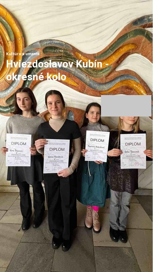 Dňa 21. 3. 2025 sa v CVČ na Popradskej 86 v Košiciach uskutočnilo okresné kolo recitátorskej súťaže Hviezdoslavov Kubín. Súťaže v umeleckom prednese poézie a prózy sa zúčastnili aj naše víťazky školského kola žiakov I. a II. stupňa. Našu školu reprezentovali: