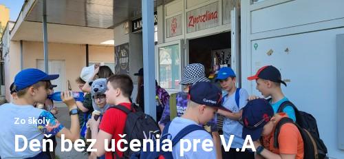 Dôsledné triedenie odpadu počas tohto školského roka zabezpečilo našej triede – V.A prvé miesto v škole. Vytúžený deň nastal v piatok 26.mája. Električkou sme sa vybrali do oddychového areálu Nad Jazerom. Spočiatku chlapci hrali futbal a dievčatá si púšťali hudbu a hrali spoločenské hry. Potom sme spoločne hrali vybíjanú a oddychovali na deke. Nakoniec sme si kúpili nanuky a zmrzlinu. Vrátili sme sa do školy šťastní a spokojní po úžasnom dni bez učenia.