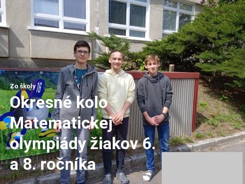 Dňa 12.4.2023 sa piati žiaci zo 6.A a traja žiaci z 8.A zúčastnili okresného kola Matematickej olympiády, kde riešili a logicky zdôvodňovali náročnejšie matematické úlohy. Zo šiestakov dosiahli najlepšie výsledky dve žiačky, ktoré sú úspešnými riešiteľkami a zároveň získali pekné umiestnenie, a to Daniela Jacková, ktorá skončila na 5. mieste a Paulína Pastuchová, ktorá skončila na 7. mieste. Žiaci ôsmeho ročníka boli všetci úspešnými riešiteľmi a navyše získali veľmi pekné umiestnenie, a to Adrián Pastucha 2. miesto, Matej Matkobiš 9. miesto a Maximilián Staroň 17. miesto. Všetkým srdečne blahoželáme.