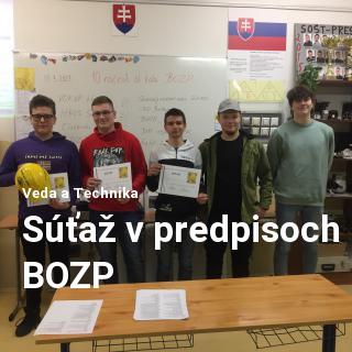 15. marca 2023 sme usporiadali už okrúhly 10. ročník šk. kola súťaže v predpisoch BOZP. Z prihlásených 34 žiakov sa zúčastnilo 23 žiakov, ktorí preukázali svoje znalosti v tejto problematike. Prví traja súťažiaci postupujú na celoslovenské kolo, ktoré bude v Žiline v dňoch 8. – 9. 6.2023.