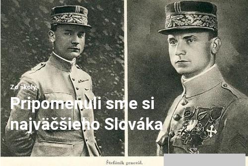 4. mája 2019 sme si pripomenuli 100. výročie smrti generála Milana Rastislava Štefánika. Na veľkú osobnosť našich dejín nezabudla ani naša škola. Žiaci ôsmeho ročníka boli teda poverení vyrobením prezentácie a kvízu pre ostatných žiakov. Prípravy sa ťahali počas celého týždňa. Každému bola pridelená časť textu, ktorý mal odprezentovať. V prezentácii sme sa spolužiakov snažili oboznámiť o živote Milana Rastislava Štefánika - od jeho detstva v Košariskách až po tragickú smrť pri Ivanke pri Dunaji. Tí, čo nás pozorne počúvali, mali výhodu, lebo nasledovala ďalšia časť nášho programu - kvíz.