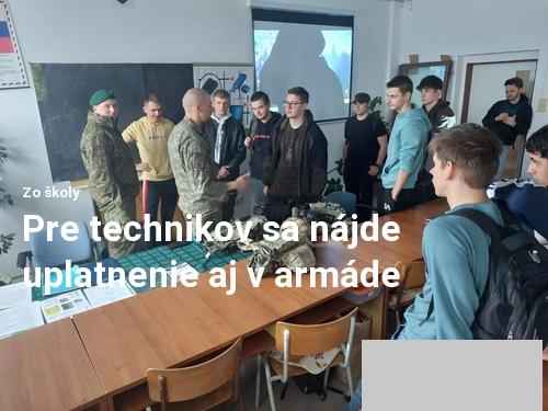 Dňa 13.03.2025 zavítali na našu Strednú odbornú školu technickú Tlmače dvaja príslušníci Ozbrojených síl SR. Cieľom ich prednášky bolo prostredníctvom prezentácie priblížiť študentom čo všetko zahŕňa práca profesionálneho vojaka – od fyzickej prípravy, cez moderné technológie v armáde, až po rôzne špecializácie a kariérny rast. Zdôraznili výhody vojenskej služby, či už stabilný a veľmi zaujímavý príjem, výsluhový dôchodok, lacné ubytovanie a stravovanie v Leviciach, ako aj získanie hodností. Predstavili podmienky vstupu do profesionálnej služby vlasti a zároveň ponúkli možnosť štúdia na Akadémii ozbrojených síl generála Milana Rastislava Štefánika v Liptovskom Mikuláši. Dôležité je vedieť, či sa žiak chce stať po skončení SŠ profesionálnym vojakom, alebo chce pokračovať v štúdiu na vojenskej akadémii. Získa tak vysokoškolské vzdelanie a zároveň sa môže pripravovať na dôstojnícku kariéru. Záujemcovia sa dozvedeli viac o podmienkach prijatia, o testoch fyzickej pripravenosti, psychodiagnostickom vyšetrení a o zdravotnej prehliadke. Veľkým benefitom je, že už počas štúdia majú študenti slušný príjem a nemusia si hradiť ubytovanie, stravovanie, ani vojenskú výstroj. Stretnutie so skúsenými vojakmi bolo pre študentov zaujímavou príležitosťou získať autentický pohľad na vojenskú profesiu. Mnohí z nich po prezentácii začali reálne zvažovať, či by práve armáda nemohla byť ich budúcou cestou. Mali pripravené otázky a prezreli a vyskúšali si aj vojenskú prilbu, granátové puzdro, ochrannú masku a kapsu. Držíme palce pri správnom rozhodnutí v otázkach "Čo a kam po škole ?". Najdôležitejšie je, aby Vás práca bavia a robili ste ju srdcom :) Bronislava Tomljenovičová