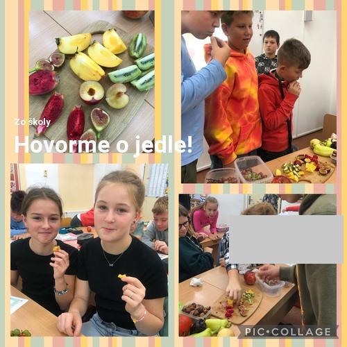 Žiaci na druhom stupni na hodine anglického jazyka skúmali ovocie a zeleninu svojim zmyslami a po anglicky opisovali chuť, vôňu alebo aj tvar a farbu daného jedla. Žiaci pripravili milú ochutnávku tradičného, ale aj exotického ovocia.