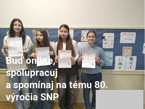 V tomto školskom roku sme sa zapojili do súťaže Buď online, spolupracuj a spomínaj na tému 80. výročia SNP, ktorú organizovala ZŠ s MŠ Zubrohlava. Cieľom súťaže bolo nadobudnúť nové zručnosti v online priestore, spolupracovať v školskom tíme i v rámci súťažných tímov zo Slovenska a vzájomne upevňovať vzťahy medzi školami. Zároveň si žiaci osvojili nové vedomosti na tému výročia SNP a pripomenuli si tieto dôležité udalosti i osobnosti s nimi späté. Nášmu súťažnému tímu v zložení žiačok - Sára Bogová, Karin Kubová, Amélia Laušová a Sarah Tomičová z VIII. B triedy pod vedením pani učiteľky Tkáčovej sa podarilo získať krásne 3. miesto.