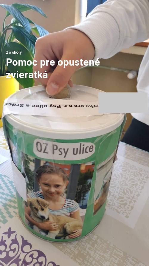 Hneď po príchode do školy, v mesiacoch september a október, sme si spomenuli na opustené zvieratká. Pani učiteľka E. Tóthová sa už dlho angažuje v oblasti ochrany zvierat, a preto sa spolu so žiakmi rozhodla pomôcť v mene našej školy. Žiaci zbierali materiálne dary ako napríklad staré oblečenie, plachty, deky, ktoré budú slúžiť ako podstieľky pre psíky, ale aj jedlo (ryža, cestoviny, psie pochúťky). Tieto dary dostanú zvieratká zastrešené organizáciami OZ Psy ulice a Srdce pre mačky. Okrem toho mohli žiaci a učitelia prispieť aj dobrovoľným finančným príspevkom, ktorý pomôže napríklad s pokrytím časti veterinárnych nákladov či každodennou starostlivosťou o zvieratá. Takto sme si pripomenuli aj medzinárodný deň zvierat – 4. október.
