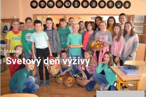 Svetový deň výživy zdôrazňuje potrebu zdravého stravovania sa. S príchodom jesene prichádzajú dni plné vitamínov z ovocných a zeleninových záhrad. Aj preto si žiaci 6. ročníkov pripravili zdravú, ovocno-zeleninovú desiatu, ktorú ponúkli všetkým žiakom našej školy. Nezabudli ani na dostatočný pitný režim. Citronáda a bylinkové čaje žiakov osviežili a dodali potrebnú energiu. Zámerom tejto akcie bol podporiť u žiakov zdravý životný štýl, viesť ich k zdravému stravovaniu aj počas prestávok v škole. Mgr. Anna Poláková.