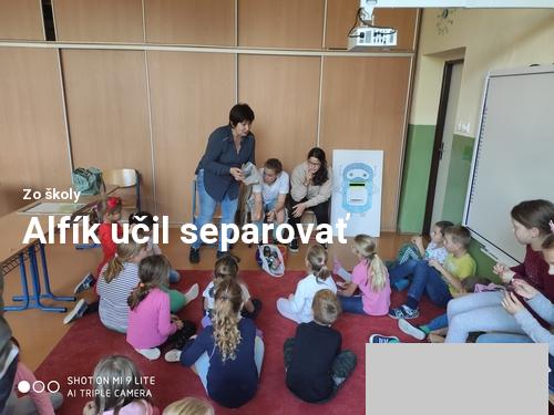 Žiačky Strednej športovej školy v Trenčíne, Viktória Šilhánová a Kristína Šoltésová, zoznámili žiakov Školského klubu v Chocholnej –Velčiciach z postavičkou mimozemšťana Alfíka. Rád papá halušky ušúľané z vrchnáčikov od jogurtov. Pochutí si i na palacinkách udupaných z plechoviek od nápojov. Keď má bruško plné, obsah bruška vysypeme do červeného kontajnera určeného na kovy. Pomôžeme separovať komunálny odpad a chránime tak prírodu, prírodné zdroje. Vskutku sa o Alfíka žiaci v CHocholnej –Velčiciach dobre postarali. Našúľali halušiek, podupali palaciniek a hladný už nebol. Keďže sa o neho tak dobre postarali, ponechali sme im ho v škole. Stretnutie prebehlo v rámci projektu Enviro škola, podporeného Trenčianskym samosprávnym krajom sumou 650 eur. Využili sme ich na nákup 28 kusov 50 litrových nádob na separovanie odpadu v Strednej športovej škole v Trenčíne.