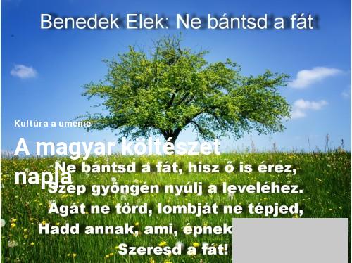A magyar költészet napjának megünneplésére készülünk a jövő héten: író-olvasó találkozót tartunk, verseket posztolunk, versíró verseny eredményét hirdetjük ki, közösen szavalunk. 2019. április 11-én 11.30-kor a Csaplár Benedek Városi Művelődési Központ előtti téren iskolánk diákjai közösen szavalják Benedek Elek Ne bántsd a fát c. versét. Szeretettel várunk mindenkit, aki velünk együtt szavalja, vagy meghallgatja ezt a szép verset.