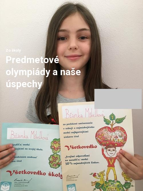 Vyhodnotili sme aj súťaže Všetkovedko a Expert geniality show. Do súťaže sa zapojilo 80 detí z I. stupňa a 33 detí z II. stupňa. Každé bolo odmenené diplomom a perom. V súťaži Všetkovedko sme po prvýkrát zaznamenali obrovský úspech. Bianka Mikelková, žiačka III.A triedy, sa zapísala do Siene slávy súťaže, ktorú reprezentujú najúspešnejší riešitelia. Gratulujeme!