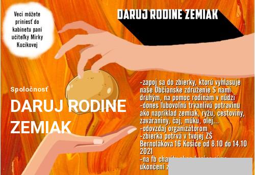 Charitatívnu zbierku "DARUJ RODINE ZEMIAK" už možno poznáte. I tento rok sme sa rozhodli, že budeme na pomoci a zrealizujeme zbierku, ktorej súčasťou môžete byť i VY. Cení sa akákoľvek trvanlivá potravina, ktorú môžeš priniesť do kabinetu pani učiteľky Mirky Kucikovej.
