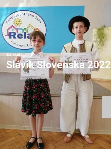 Dňa 11.5.2022 sa v CVČ Relax v Rimavskej Sobote uskutočnilo okresné kolo speváckej súťaže Slávik Slovenska 2022. Naši žiaci boli úspešní: v 1. kategórií Dominika Kántorová z III.C triedy obsadila 3. miesto, v 2. kategórií Július Baník zo IV.B triedy obsadil 2. miesto. Obidvom žiakom blahoželáme a ďakujeme za úspešnú reprezentáciu našej školy. Zároveň vyjadrujeme poďakovanie PaedDr. Janke Dobrockej zo ZUŠ v Rimavskej Sobote za hudobný doprovod na akordeóne.