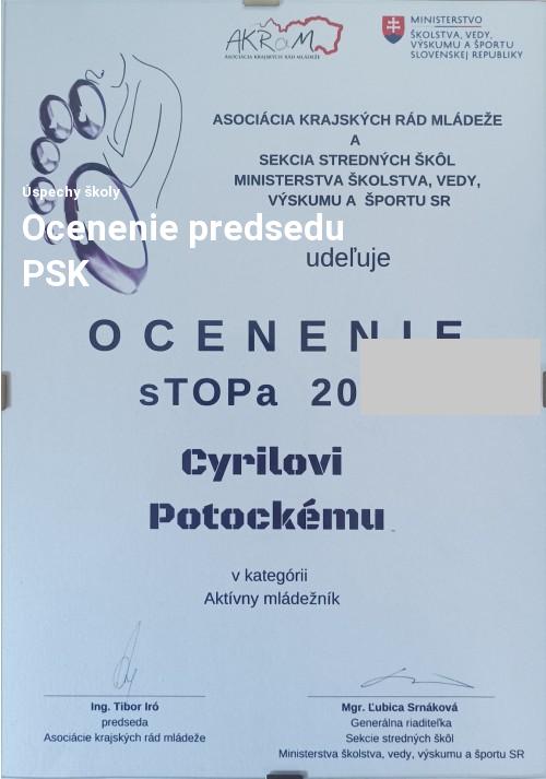 V piatok 25. novembra 2022 sa uskutočnilo oceňovanie aktívnych mládežníkov a pracovníkov s mládežou PSK v Poprade. Zúčastnil sa ho aj náš predseda Školského parlamentu Cyril Potocký z III.B triedy, ktorý na základe nominácie našim Školským parlamentom na titul aktívneho mládežníka aj uspel a ocenenie získal. Cyril je majstrom Slovenska v leteckom modelárstve v roku 2021, je členom DHZ a spevokolu v Ľuboticiach, aktívne prispieva do komunitného života vo svojej lokalite ako aj na našej škole. Aktívne reprezentuje školu v rámci PSK formou zasadnutí školských parlamentov, konferencií, vzdelávaní a dobrovoľníctve. Zo srdca blahoželáme! Za Školský parlament: Mgr. Alena Šálková