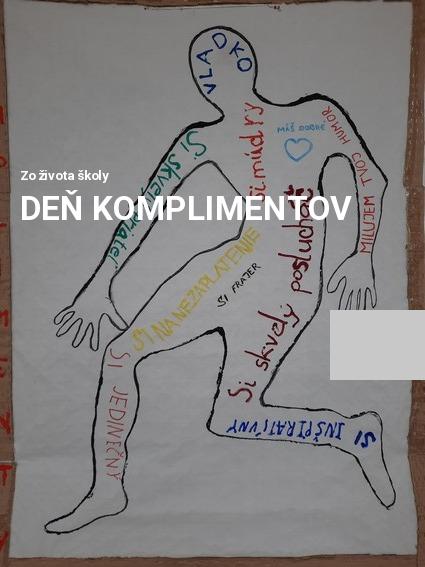 Ľudské slovo má veľkú silu, vie človeka povzbudiť, láskavo pohladiť, ale aj zraniť a ublížiť. Na okamih sa zamyslime, kedy naposledy sme niekomu povedali niečo milé? Lichôtka, prejav úcty, zdvorilosti, či poklony charakterizuje deň, ktorý je určený komplimentom. Každý z nás má rád pochvalu alebo úprimne mienenú poklonu, každý chce zažiť príjemný pocit výnimočnosti, ktorý mu vyčarí úsmev na tvári, zlepší náladu a dodá pocit istoty a dokonalosti. Takto príjemne sa mohli cítiť aj žiaci a zamestnanci našej školy na Deň komplimentov, ktorého cieľom bolo povedať si navzájom čo najviac milých slov a oceniť to, čo sa nám páči na iných. Naši žiaci i zamestnanci si vyskúšali, aké to je kompliment dať a zároveň aj prijať. Zistili, ako málo stačí k tomu, aby niekomu spríjemnili deň. Po škole boli rozmiestnené vopred pripravené komplimenty, ktoré si mohli odtrhnúť a darovať osobe, ktorú majú radi. Komplimenty si adresovali osobne, ale aj písomne. Veď láskavé slová pôsobia na nás ako liečivý dážď. Výsledkom zozbieraných komplimentov bol strom komplimentov a silueta ľudského tela vyplnená milými a úprimnými výrokmi vo viacerých jazykoch. Našim želaním je, aby sme si pekné a milé slová nevraveli len v tento špeciálny deň, ale aby sa stali každodennou súčasťou nášho života. Potom bude každý deň krajší a lepší... :)