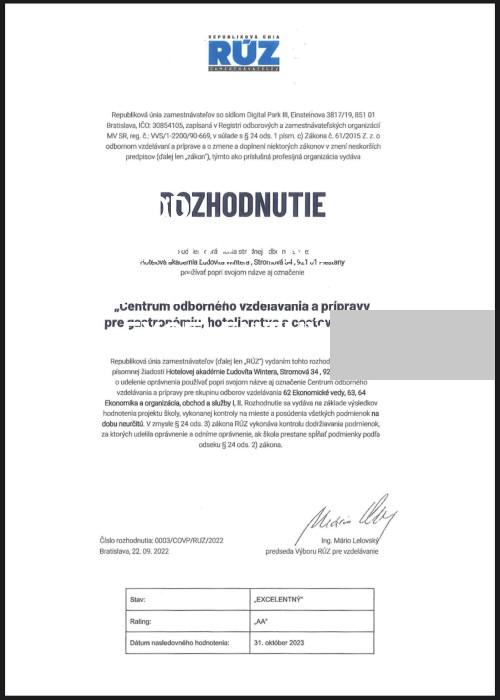 👉 budeš študovať v centre odborného vzdelávania a prípravy pre gastronómiu, hotelierstvo a cestovný ruch s hodnotením ZAMESTNÁVATEĽOV - RATING - AA EXCELENTNÝ