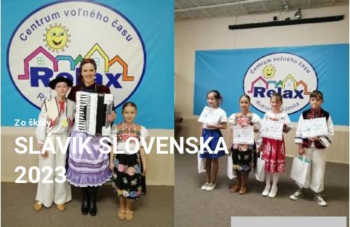 Dňa 16.5.2023 sa v CVČ Relax konalo okresné kolo 31. ročníka súťaže v interpretácii slovenských ľudových piesní Slávik Slovenska 2023. Našu školu reprezentovali: v 1. kategórii Dorotka Gödriová z II.C v 2. kategórii Július Baník z V.B Obom žiakom ďakujeme za úspešnú reprezentáciu a Dorotke blahoželáme k 3. miestu. Ďakujeme a tešíme sa s Vami.