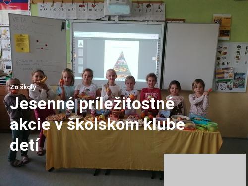 Jesenné obdobie v našom školskom klube si okrem bežných aktivít, ktoré prebiehajú počas popoludnia v jednotlivých výchovných oddeleniach spestrujeme aj príležitostnými akciami. Už tradičné a obľúbené býva ,,Vitamínové popoludnie“. Deti si prinesú rôzne druhy ovocia a zeleniny, na ochutnávku prinesú aj sušené ovocie, ovocný koláč, výživu, alebo rôzne iné dobroty, plné vitamínov. Pani vychovávateľky potom pripravia zábavné súťaže, pracovné listy, prezentácie a tak si pripomenú význam vitamínov a zdravej výživy v našom jedálničku. Je to akcia, ktorú robíme aj v spolupráci s rodičmi.