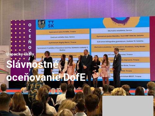 Dňa 26. septembra 2023 sa v budove Slovenskej sporiteľni v Bratislave uskutočnil slávnostný ceremoniál odovzdávania bronzových a strieborných ocenení úspešným absolventom programu DofE.Z našej školy po celoročnej práci a splnení svojich cieľov v oblasti talentu, športu, dobrovoľníctva a dobrodružnej expedícii získalo bronzové ocenenie 18 žiakov (II.A – A. Hladká, II.B – K. Klampárová, K. Kuglerová, L. Kurimčáková, E. Pekarovičová, K. Poláková, K. Somorovská, V. Szucsová, K. Šeborová, P. Šulko, II.G – S. Nemčic, N. Rybaničová, III.G – D. Horváthová, M. Gazárková, III.C – A. Slobodová, IV.G – J. Siva, II.F – T. Brezovská, V. Měřinská). Zároveň boli ocenené i žiačky rozvojového programu Stand by Me z triedy II. B (L. Bednárová, D. Kobelárová, M. Kozma, A. Zavidliak). V rámci Trnavského samosprávneho kraja boli jediné, ktoré úspešne ukončili tento program. Oceneným žiakom sa prihovorili a zablahoželali podpredseda TTSK Rastislav Mráz a riaditeľ Národnej Kancelárie DofE na Slovensku Miloš Ondrášek. Všetkých prítomných zaujal videopozdrav súčasného vojvodu z Edinburghu, princa Edwarda, držiteľa zlatého ocenenia DofE. Všetci naši ocenení žiaci spolu s riaditeľkou školy Katarínou Hrašnovou, vedúcimi programu Janou Štefánikovou, Henrietou Horváthovou a mentorkou Stand by Me Luciou Áčovou si užili slávnostnú atmosféru ocenenia a odchádzali plní dojmov, entuziazmu, nových nápadov a chute do ďalšej práce.