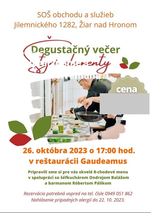Žiaci študijného odboru hotelová akadémia pripravili spolu s úspešnými absolventami našej školy -šéfkuchármi z praxe, degustačný večer Štyri elementy. Ďakujeme za spoluprácu a vážime si, že sa absolventi radi do svojej školy vracajú a odovzdávajú svoje skúsenosti mladej generácií.