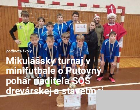 V prvú decembrovú sobotu sa v Strednej odbornej škole drevárskej a stavebnej v Krásne nad Kysucou uskutočnil Mikulášsky turnaj v minifutbale o Putovný pohár riaditeľa Strednej odbornej školy drevárskej a stavebnej. Tejto akcie sa zúčastnilo sedem družstiev základných škôl: Krásno nad Kysucou, Zborov nad Bystricou, Stará Bystrica, Oščadnica – Ústredie, Skalité, Vysoká nad Kysucou a Lodno. Prvé miesto získali žiaci Základnej školy z Krásna nad Kysucou, na druhom mieste skončili žiaci Základnej školy z Lodna a na treťom mieste sa umiestnili žiaci Základnej školy zo Skalitého. Za najlepšieho hráča bol vyhlásený Matej Ondrúšek zo Základnej školy z Krásna nad Kysucou a za najlepšieho brankára bol vyhlásený Sebastián Jakubec z Lodna. Mikulášsky turnaj slávnostne otvoril riaditeľ školy Ján Palko, ktorý zaželal zúčastneným družstvám presné strely a veľa šťastia v zápasoch. Na záver vyhodnotil turnaj a odovzdal víťazným družstvám ceny. Poďakovanie patrí všetkým trénerom za prípravu svojich zverencov, že ich dokázali veľmi dobre pripraviť na Mikulášsky turnaj. Každý z účastníkov dostal mikulášsky balíček sladkostí. Celý turnaj sa niesol v mikulášskej sviatočnej atmosfére a všetci sa už tešíme na budúcoročný turnaj, kedy si ďalší deviataci zmerajú svoje sily spolu s jednotlivými súpermi.