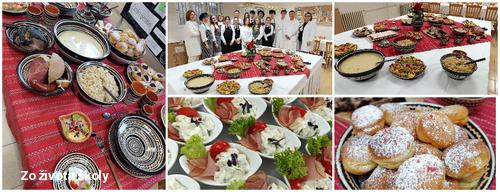 V spolupráci so žiakmi druhého ročníka sme v rámci hodín CCJ rozhodli vrátiť v čase a navariť si pravé fašiangové jedlá. Priniesli sme tkané obrusy, poumývali krásnu keramiku, zamiesili cesto, postavili fazuľu a s chuťou sa pustili do príprav fašiangových dobrôt. Naše menu pozostávalo z kombinácií starých receptov a moderných trendov. Spoločne sme si pochutili na naozaj bohatom menu, ktoré tvorila fazuľová polievka s údeným mäsom, pomaly pečená bravčová krkovička obalená v kávovej chraste so strapačkami s kyslou kapustou a údenou slaninou, nechýbali šišky s džemom, šišky plnené karamelovým krémom, fánky bohato obalené v škoricovom cukre, hnetený jablkový koláč s lyofilizovanými jahodami. Pripravili sme tiež niekoľko kanapiek s tradičnými i menej tradičnými nátierkami: bryndzovou, mäsovou, vajíčkovou, škvarkovou, ktoré sme ozdobili trendovými mikrobylinkami. Z tradičných jedál sme doplnili na stôl varenú klobásu, slaninu, cibuľu, cesnak a čerstvý domáci chlieb. Vôňa jedál sa niesla chodbami školy a spoločne sme si pochutnali na pripravených jedlách.