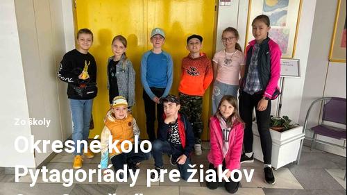 V dňoch 9. a 10. 4. 2024 sa v CVČ Domino uskutočnilo okresné kolo Pytagoriády pre žiakov 3. – 8. ročníka. Našu školu reprezentovali žiaci: Richard Tomčko 3.A, Radka Pančurová 3.C, Michal Sloboda 4.A, Sofia Toporová 4.A, z 5. A triedy Alexandra Lukáčová a Katarína Hromjáková, zo 6.A triedy Jakub Kurian, zo 6. B triedy Sofia Borodina a z 8. A triedy Eva Psotová, Lea Dubovská, Sofia Zniszczolová a Tamara Begéniová, ktorí boli úspešnými riešiteľmi. Eva Psotová obsadila krásne 4. miesto a postupuje na celoslovenské kolo. Všetkým srdečne blahoželáme.