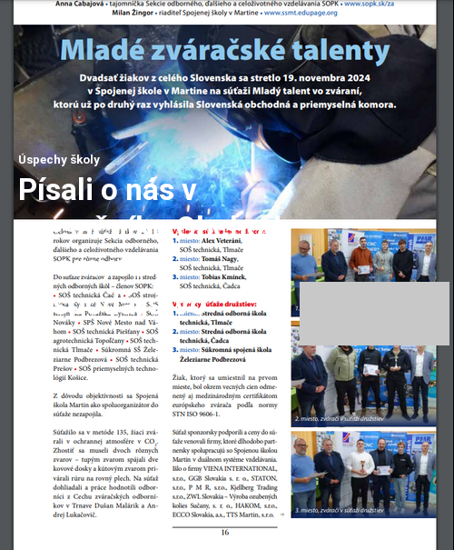 Dňa 19. novembra 2024 sa v Spojenej škole v Martine uskutočnil už druhý ročník celoslovenskej súťaže Mladý talent vo zváraní, ktorá je príležitosťou na prezentáciu mladých odborníkov v oblasti zvárania. Máme veľkú radosť z toho, že naši žiaci opäť preukázali svoje výnimočné zručnosti a technické schopnosti. Do súťaže sa prihlásilo 11 škôl zo Slovenska, ktoré sa stretli v dvoch kategóriách – v súťaži jednotlivcov a družstiev v metóde 135 (CO2 zváranie). Naši žiaci sa rozhodne nestratili, keďže v oboch kategóriách dosiahli vynikajúce výsledky. V kategórii družstiev sme sa umiestnili na prvom mieste, čím sme obhájili našu pozíciu lídrov v oblasti zvárania. Naše družstvo z Tlmač získalo zlatú medailu, čo je skvelý výsledok a dôkazom kvalitnej prípravy. Na druhom mieste skončilo družstvo zo Strednej odbornej školy technickej v Čadci a na treťom mieste družstvo zo Súkromnej strednej školy Železiarne Podbrezová. V kategórii jednotlivcov sme si tiež pripísali dva cenné triumfy. Na prvom mieste sa umiestnil Alex Veteráni a na druhom mieste Tomáš Nagy, obaja žiaci 3.E triedy, odbor mechanik strojov a zariadení. Na treťom mieste sa umiestnil Tobias Kmínek zo Strednej odbornej školy technickej v Čadci. Títo úspešní žiaci sú talentovaní zvárači, ktorí sa neustále usilujú o zdokonaľovanie svojich zručností. Ich víťazstvá sú nie len výsledkom ich tvrdej práce a vytrvalosti, ale aj kvalitnej odbornej prípravy, ktorú im poskytujeme na našej škole. Osobitne by sme chceli vyzdvihnúť prácu Bc. Jána Salaja, nášho majstra odbornej výchovy a zváracieho inštruktora zvaračskej školy, ktorý sa podieľal na príprave žiakov na túto súťaž. Jeho odborné vedenie a trpezlivosť sa prejavili vo výnimočných výsledkoch našich žiakov. Víťazi súťaže okrem vecných cien získali aj prestížny Medzinárodný certifikát európskeho zvárača podľa STN ISO 9606-1, čo je veľký krok vpred na ich kariérnej ceste. Tento certifikát im otvorí dvere na medzinárodný trh práce, kde budú môcť uplatniť svoje odborné zručnosti. Súťaž Mladý talent vo zváraní je nielen príležitosťou pre žiakov ukázať svoje zváračské zručnosti, ale aj platformou, ktorá podporuje spoluprácu medzi školami. Na záver by sme chceli ešte raz zablahoželať všetkým oceneným žiakom, ktorí reprezentovali našu školu, a zaželať im veľa ďalších úspechov na ich ceste odborného rastu. Tento úspech je pre nás všetkých veľkým povzbudením a dôkazom, že kvalitné technické vzdelávanie na Slovensku má svoju silnú tradíciu a perspektívu práve na našej škole. Chceme vyjadriť svoju hrdosť na našich žiakov a poďakovať všetkým, ktorí sa na tomto úspechu podieľali. Tešíme sa na ďalšie výzvy a veríme, že naši mladí zvárači budú aj naďalej excelovať v tejto náročnej a veľmi potrebnej profesii.