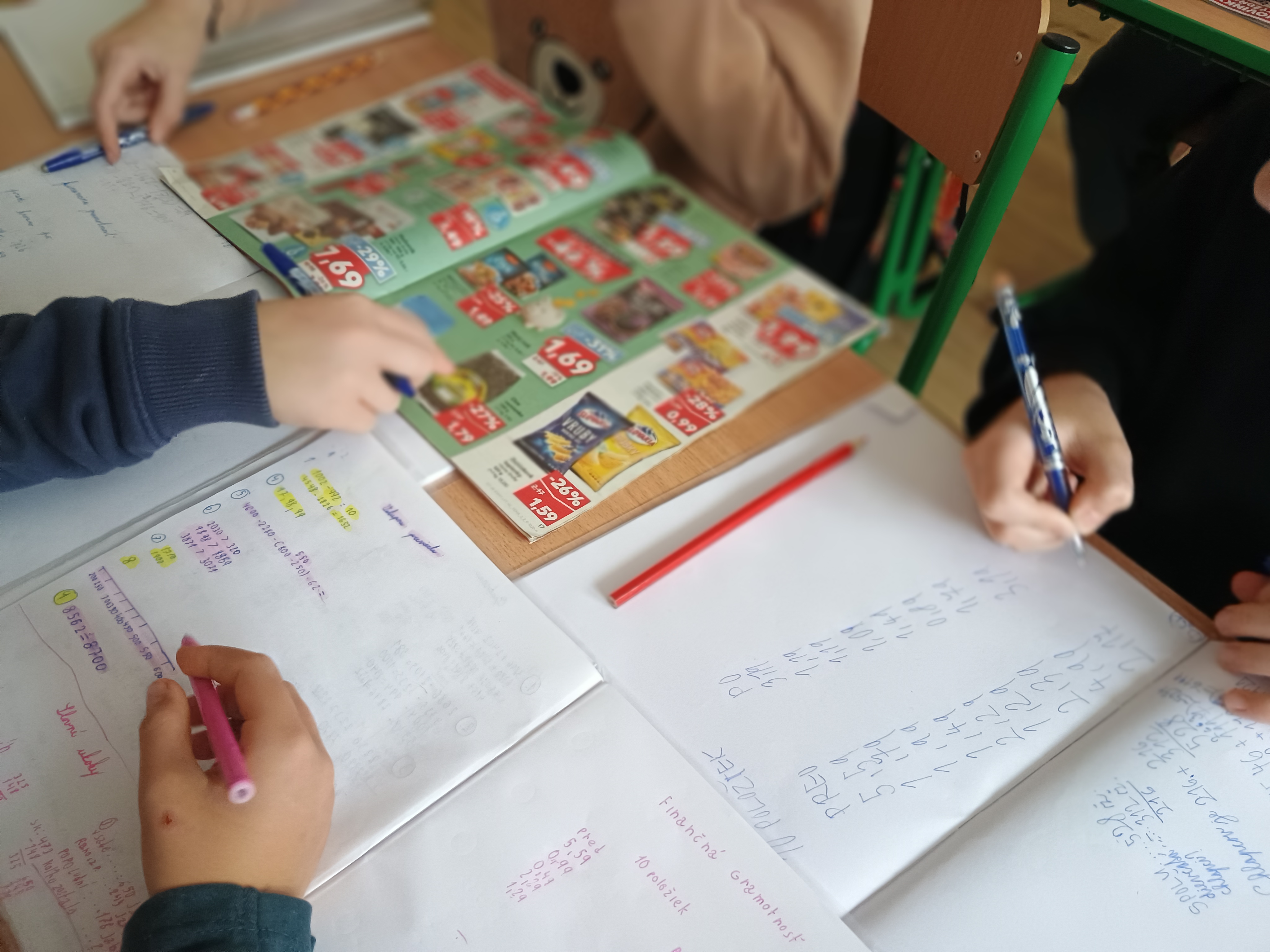 V mesiaci október sme začali s aktivitami z finančnej gramotnosti. Žiaci 5. ročníka odhadovali ceny potravín. Z letáku obchodného reťazca vybrali 10 položiek pred a po zlacnení. Vypočítavali rozdiel. Za úlohu mali nájsť ďalší tovar, ktorý by si mohli za vypočítaný rozdiel kúpiť.