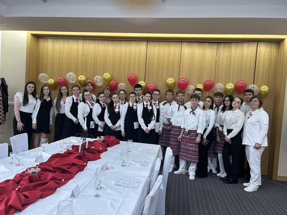 V stredu 19. 11. 2025 si trieda III. B vyskúšala realizáciu slávnostného banketu pri príležitosti predpremiéry filmu Duchoň. V elegantne vyzdobených priestoroch školy, štylizovaných do atmosféry 70. a 80. rokov, kde dominovala červená, biela a čierna farba, sa konala udalosť, ktorá by určite potešila aj samotného Karola Duchoňa. Menu bolo majstrovskou ukážkou kreativity a zručností: • Predjedlo: Bohémia šalát, klasika slovenských lahôdok, bol servírovaný s elegantným obložením a dôrazom na prémiové suroviny. • Polievka: Slepačí vývar s celestínskymi rezancami, tradičná a upokojujúca, no podávaná v sofistikovanom prevedení. • Hlavný chod: Grilovaná bravčová panenka doplnená o zemiak plnený bryndzou a fazuľové struky obalené v slanine, a to všetko preliate redukovaným slivkovým demiglace. Toto jedlo efektne spojilo slovenské chute s modernými gastronomickými technikami. • Dezert: Menu uzavrel veterník vo francúzskom štýle – odľahčená a elegantná verzia obľúbeného múčnika. Od slávnostného prípitku až po digestív podávaný na záver, každé sústo a každý nápoj niesol stopu precíznej práce žiakov. Atmosféru dokonale dotvárala dobová hudba. Z reproduktorov sa ozývali starostlivo vybrané nahrávky najväčších hitov Karola Duchoňa, čím sa vytvorila autentická kulisa a navodila tú správnu náladu. Našou inšpiráciou bol nielen film, ale aj snaha ukázať, že aj v školskom prostredí vieme vytvoriť zážitok na úrovni špičkovej reštaurácie. "Naše poďakovanie patrí pani učiteľkám Bc. Paľovej a Mgr. Krompaskej za ich odborné vedenie, trpezlivosť a neoceniteľnú prácu pri koordinácii príprav slávnostného banketu. Zároveň ďakujeme všetkým žiakom triedy III. B za ich pracovitosť, nadšenie a aktívnu účasť na tomto úspešnom podujatí." Tím manažérok Timea Lazorová, Alexandra Magdová, Helena Vasiľová