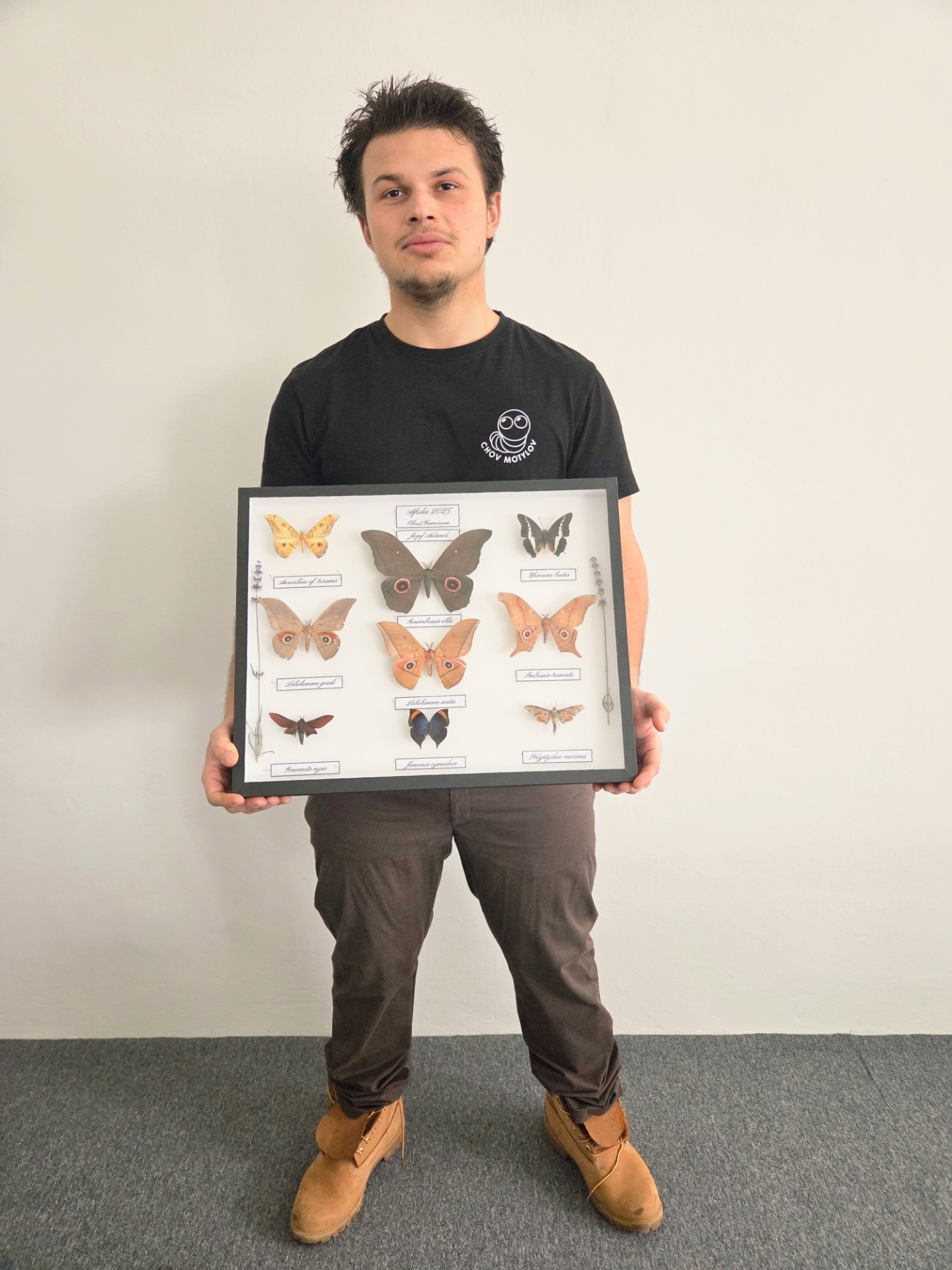 Dňa 9.12.2025 nás navštívil náš bývalý študent, absolvent veterinárneho odboru, Jozef Adámek, vášnivý chovateľ motýľov. Potešil školu plnohodnotným darom z výskumných a objaviteľských ciest v Afrike v podobe vypreparovaných motýľov. Tieto vzácne exempláre a najmä samotnú návštevu si veľmi vážime. Taktiež porozprával o svojich zážitkoch z ďalekej Afriky triede 2.B rovnakého zamerania ako mladý chovateľ. Okrem fotiek a ukážok motýľov venoval časť prednášky dôležitosti rozvoja biodiverzity a nástrahám jej degradácie. Ďakujeme za ochotu vnášať medzi mladých ľudí povedomie o prírode.