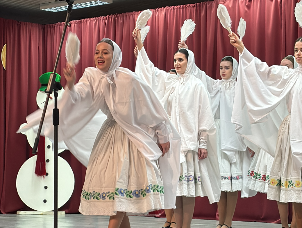 Dňa 17. 12. 2025 naši žiaci 3. - 9. ročníka mali možnosť vidieť a zažiť umenie folklórneho súboru Železiar. Tento súbor patrí medzi najznámejšie a najuznávanejšie súbory na Slovensku. Vznikol už v roku 1964. Svojimi vystúpeniami prezentuje ľudové umenie z regiónov Abov, Zemplín, Šariš či Spiš. My sme mali možnosť vidieť ich Vianočný výchovný koncert. Program bol zameraný na zvyky a tradície našich predkov, ktoré sa viažu k predvianočnému obdobiu. Videli sme karičku, párový tanec z Jakubovian, valašský tanec mládencov, ale aj zvyky, ktoré sa robievali v tzv. stridžie dni a na Luciu. Žiaci sa dozvedeli, na čo slúžil tzv. Luciin stolček, či prečo sa sypal mak cestou z kostola, alebo prečo sa lialo olovo do vody... Zopakovali si, aké jedlá zvykneme v našom regióne jedávať na štedrú večeru a aké zvyky z minulosti v našich domácnostiach pretrvávajú dodnes. Program bol interaktívny. Naši žiaci ocenili možnosť vyjsť na pódium a zatancovať si. Spolu s folkloristami mali možnosť naučiť sa krokové prvky ľudového tanca a vyskúšať si karičku. Program sa nám veľmi páčil, Železiar si radi pozrieme aj na budúce.