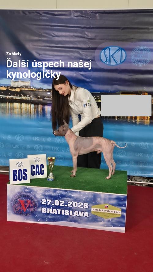 Žiačka 2.A triedy Paulína Jankovičová sa dňa 27.februára 2026 zúčastnila Národnej výstavy psov všetkých plemien v Bratislave. Paulínka so svojím psom Comoddus Busuri Kingdom's Army, plemena Americký bezrstý teriér, získala ocenenia výborný - V1, CAC, BOS a víťaz Slovenska. Obom patrí veľká gratulácia :)