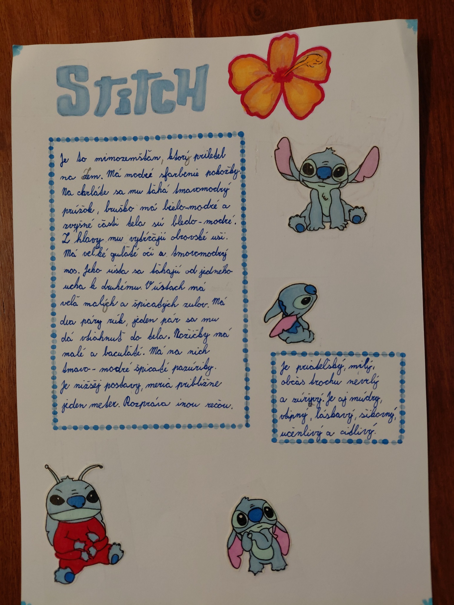 Je to mimozemšťan, ktorý priletel na planétu Zem. Má modré sfarbenie pokožky. Na chrbte sa mu ťahá tmavomodrý vlnkový prúžok. Bruško má bielo-modré a zvyšné časti telíčka sú bledo-modré. Z hlavy mu vytŕčajú obrovské uši. Má veľké, guľaté oči a tmavomodrý nos. Jeho ústa sa ťahajú od jedného ucha k druhému. V ústach má veľa malých, ale špicatých zubov. Má dva páry rúk, jeden sa mu dá vtiahnuť do tela. Nožičky má malé a bacuľaté. Má na nich tmavomodré pazúriky. Je nižšej postavy, meria približne jeden meter. Rozpráva inou rečou. Je milý, priateľský občas trochu nevrlý a zúrivý. Je aj múdry, vtipný, láskavý, šikovný, učenlivý a citlivý.